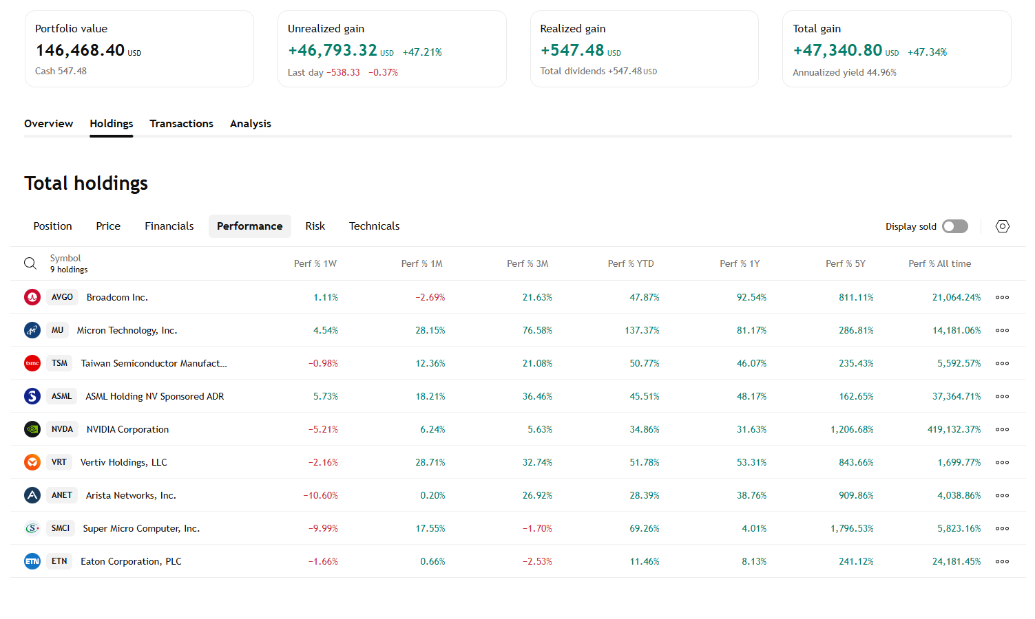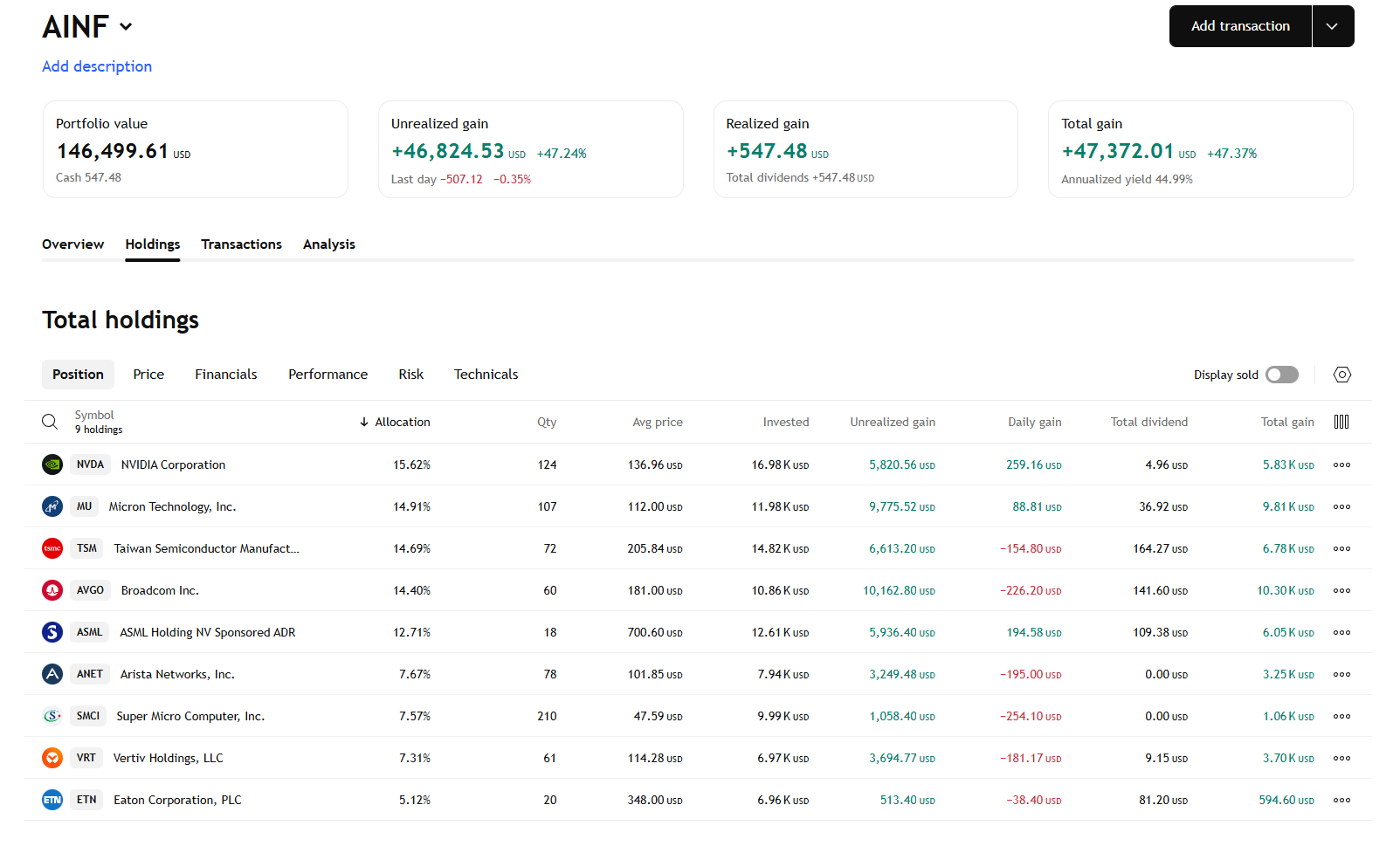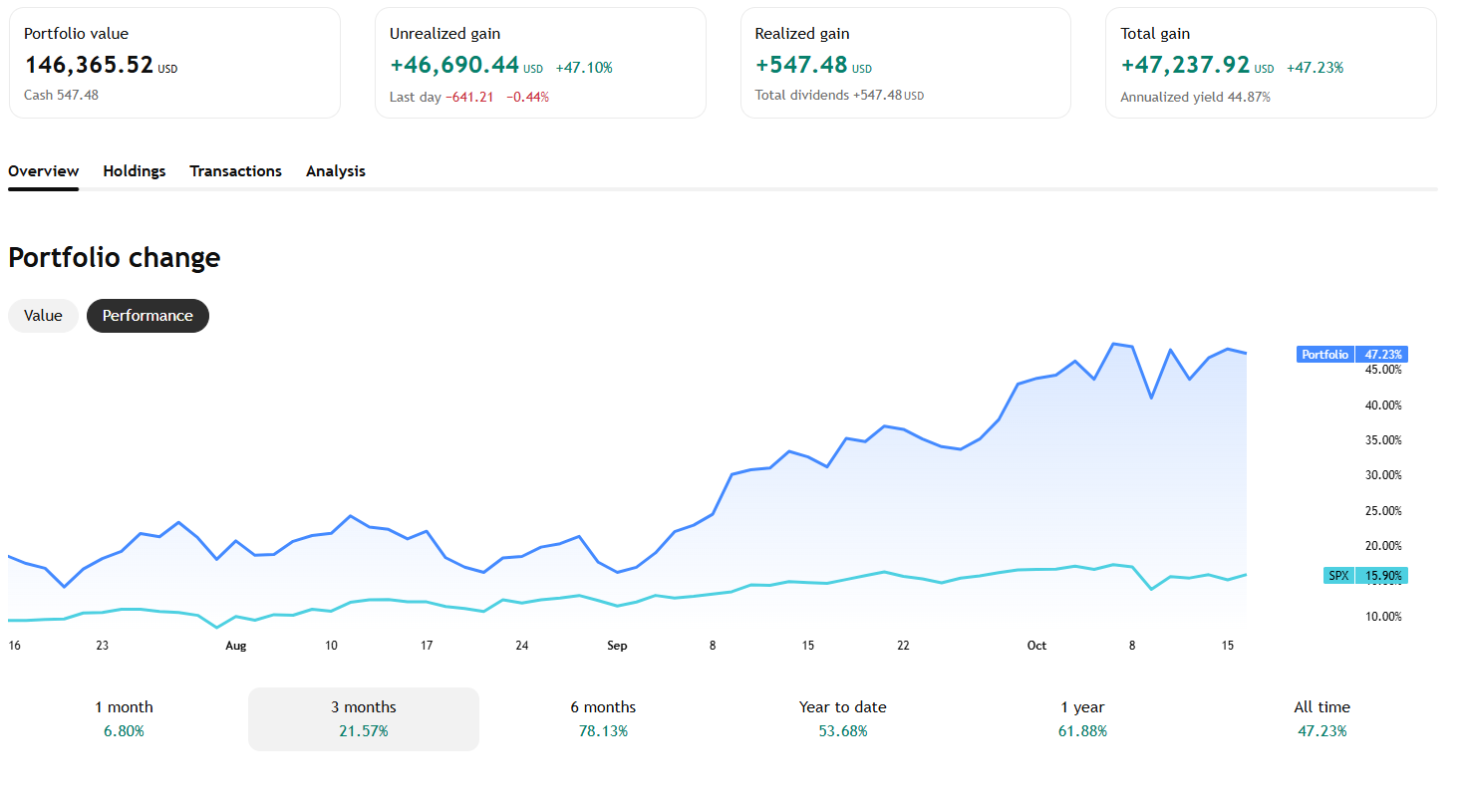 Here are screenshots from an example portfolio following these holdings for the past year, starting with: $100,000 invested.
