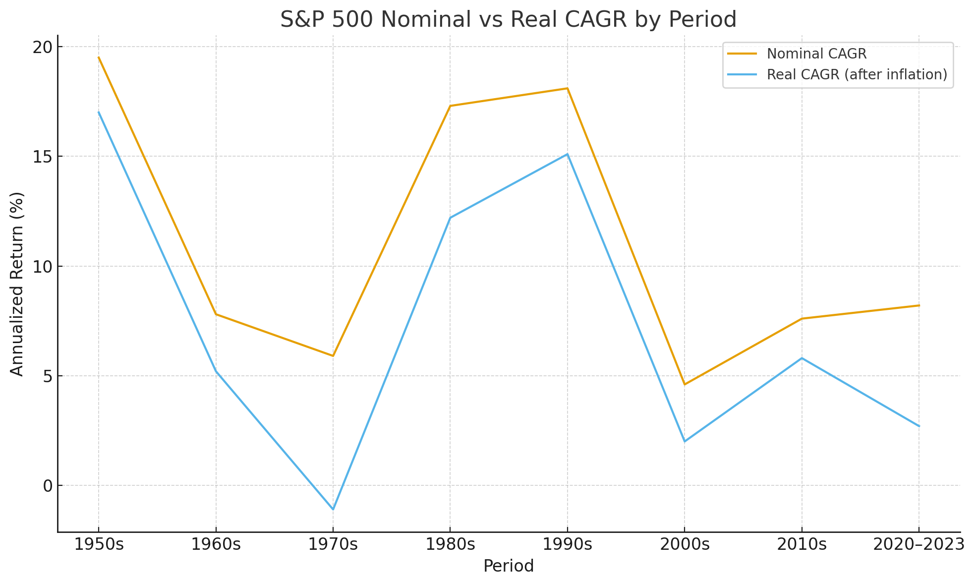 | Decade | Average Inflation | Nominal S&P 500 CAGR | Real CAGR (After Inflation) |