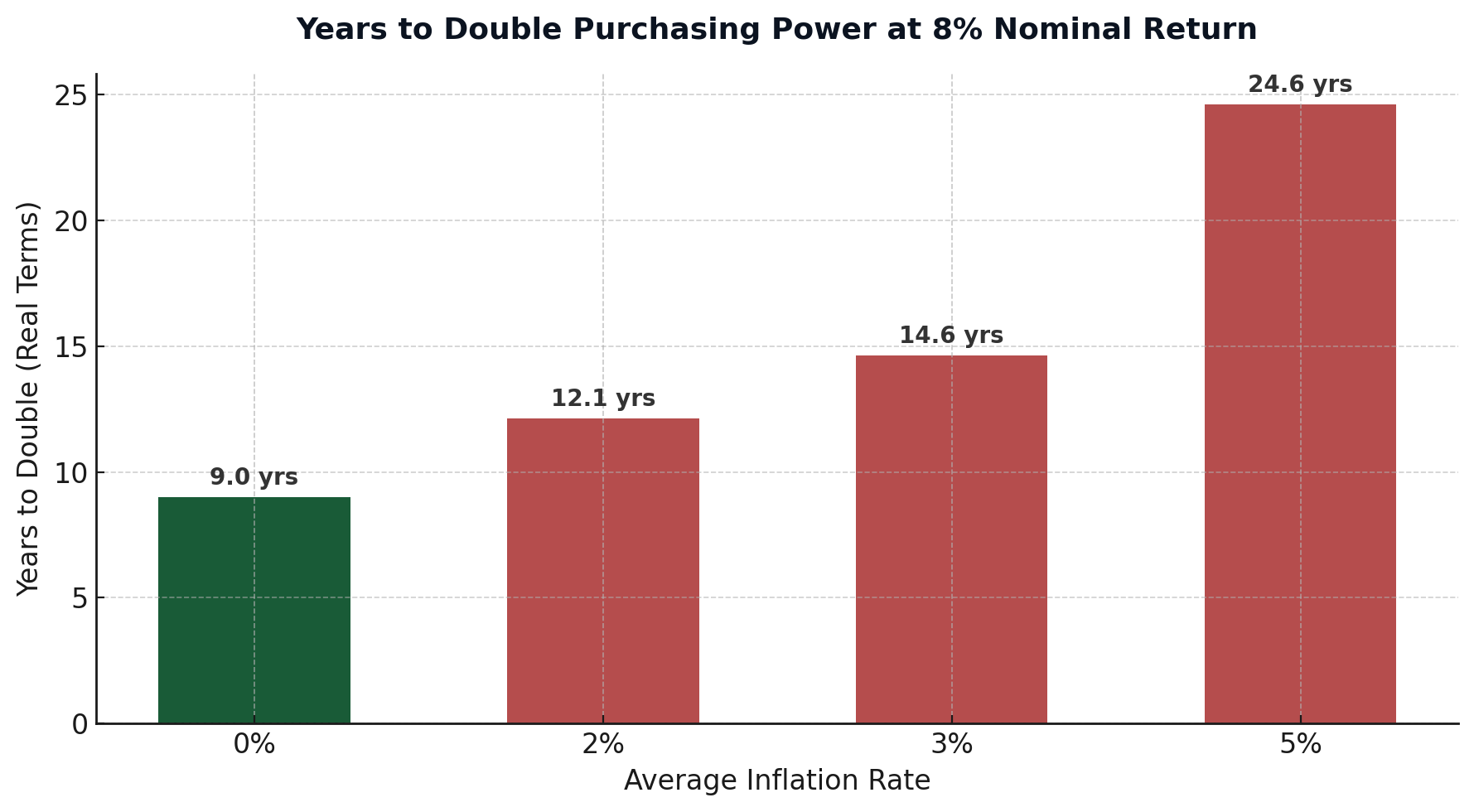 Imagine two investors aiming to double their purchasing power. One lives in a world of zero inflation and earns 8 percent a year. The other faces 3 percent inflation while earning the same 8 percent nominal return. The first investor doubles their money in about nine years. The second takes nearly fifteen. Nothing about their portfolios changed — the difference is entirely time lost to inflation.