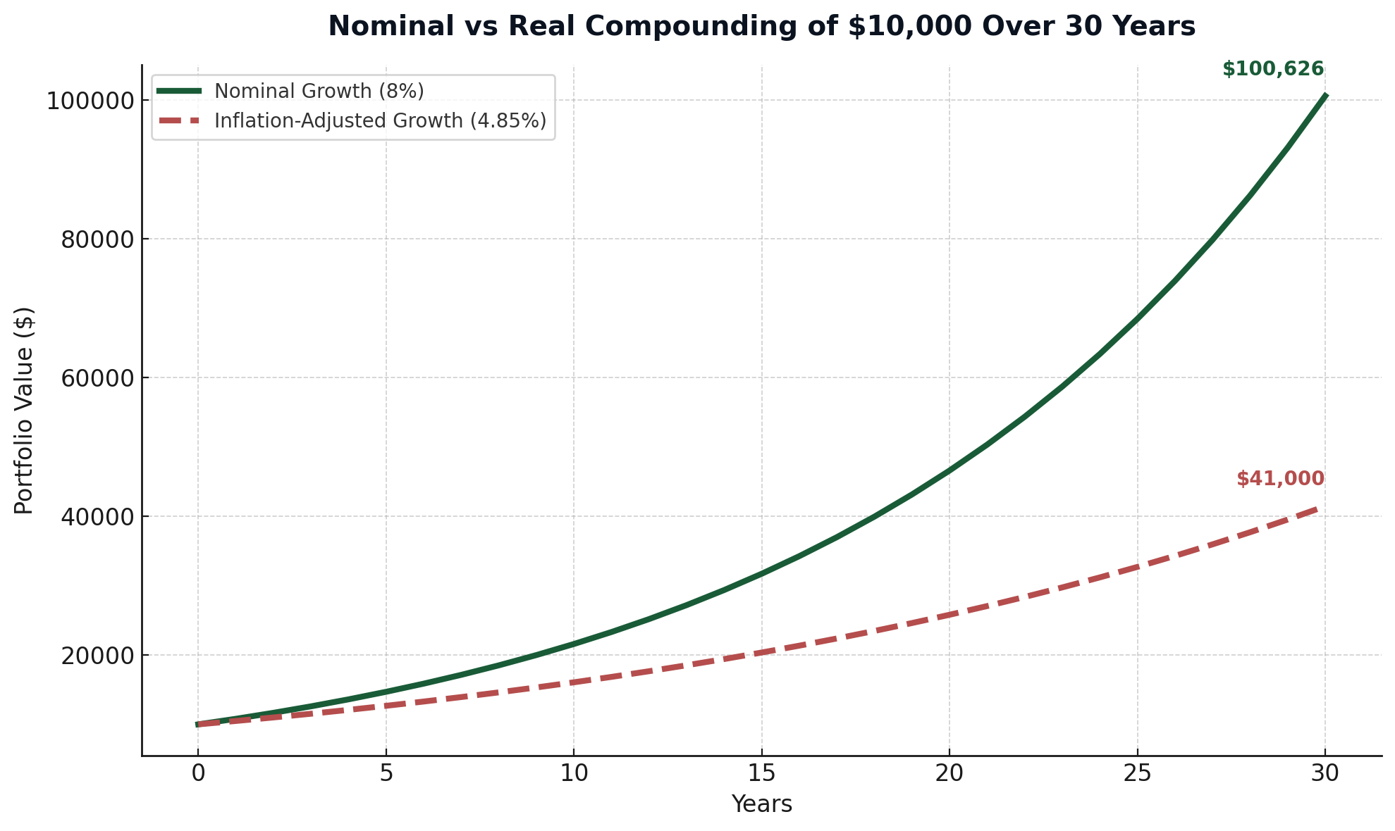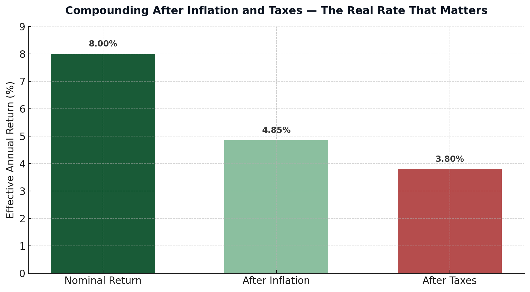 An 8 percent nominal return in a 3 percent inflation environment is not eight percent wealth creation. It is roughly five percent real growth. Over three decades, that difference compounds into a wide gap between perceived and actual purchasing power.