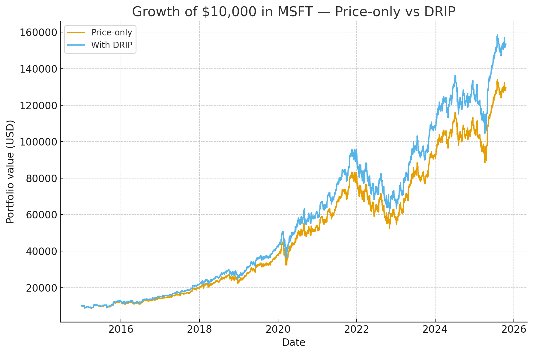 Microsoft’s dividend yield has remained modest, typically between 0.7% and 1.2%, yet the consistency of its payouts and rapid earnings expansion made reinvestment highly effective. A $10,000 investment grew to about $34,000 with full reinvestment compared to $31,000 from price appreciation alone. That $3,000 difference represents nearly 10% of total gains — an edge created purely by compounding.