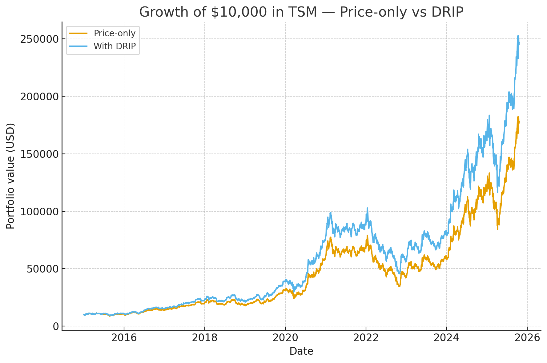 An initial $10,000 investment in TSMC in 2015 would have grown to $32,469 by 2025 under a full dividend reinvestment plan. Without reinvesting, the same investment would be worth roughly $28,000, showing that compounding dividends added over $4,000 in excess value. This translates to an approximate 224% total return with DRIP, compared to 180% from price growth alone.