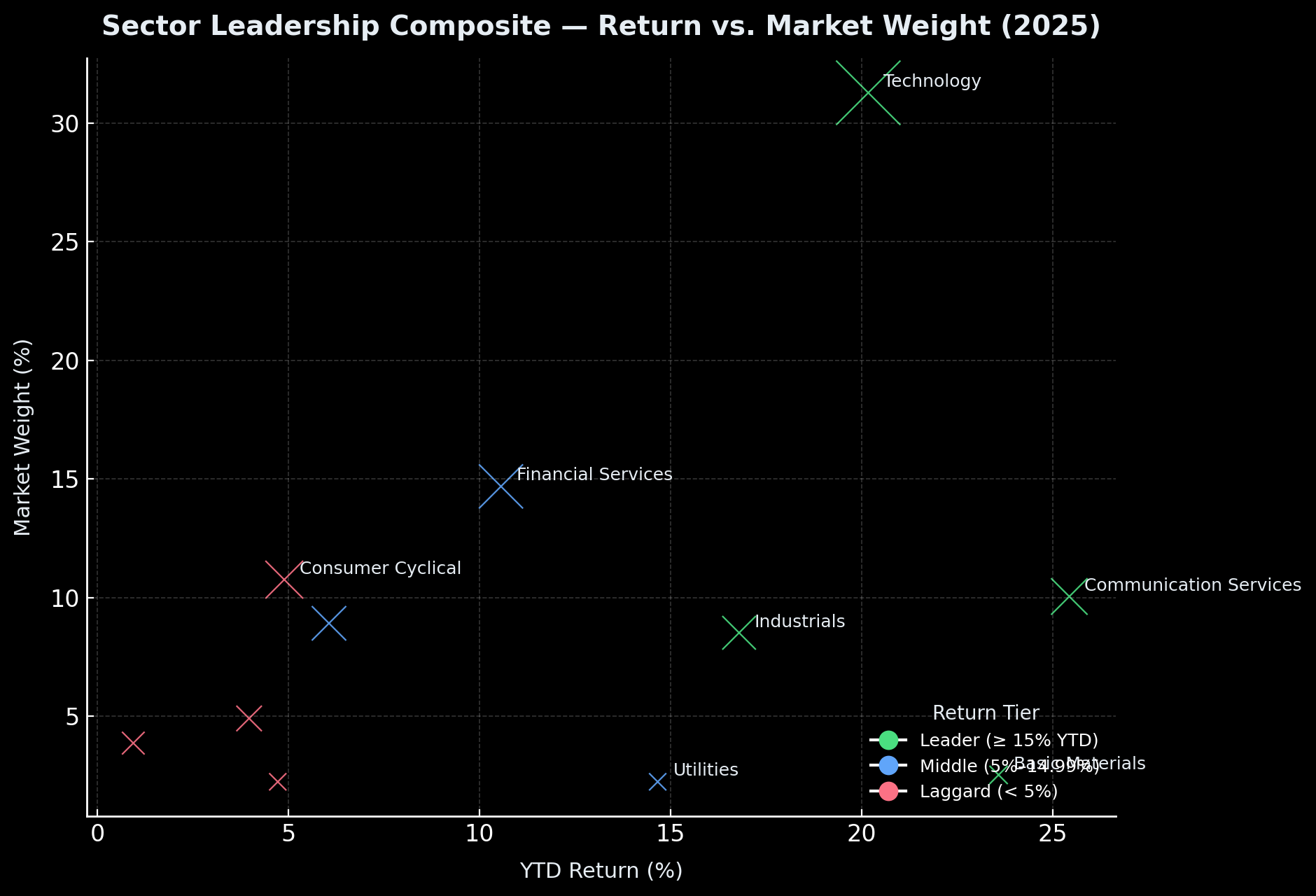 Technology remains the cornerstone of the 2025 market, advancing 20.17% year to date. With a 31.28% market weight, it continues to exert the greatest influence on overall market direction.