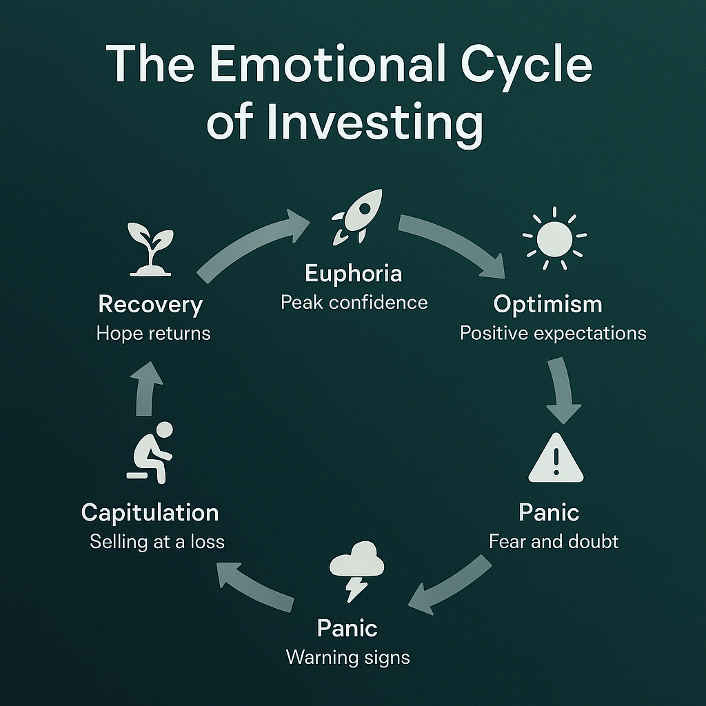 Investor behavior follows a predictable emotional cycle that repeats across every bull and bear market. Optimism builds as prices rise, turning into confidence and eventually into euphoria. When volatility returns, confidence turns into anxiety, then into fear, and finally into capitulation. Most investors buy near peaks and sell near lows because they allow emotion to guide action.