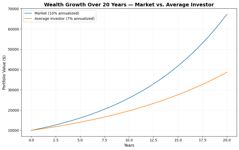 This gap may seem small on paper, but it becomes enormous over time. A consistent three percent lag each year over two decades means an investor ends up with nearly 40 percent less total wealth than someone who simply matched the market. Even investors who own index funds experience this drag, as Morningstar data shows that the typical passive investor still trails their fund’s stated return by about one percent annually due to poor timing of contributions and withdrawals.