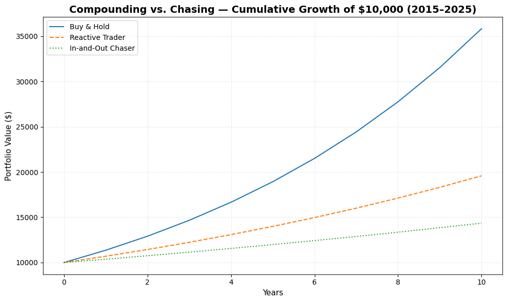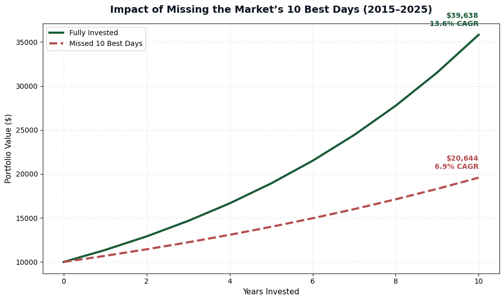 - From 2015 to 2025, a fully invested portfolio grew from $10,000 to $39,638 at a 13.6% CAGR. Missing the 10, 20, and 30 best trading days reduced annual returns to 6.9%, 3.7%, and 1.1% respectively.