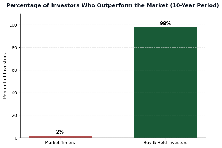 - Timing the market feels rational but statistically fails. Over 98% of market timers underperform long-term buy-and-hold strategies over a decade.