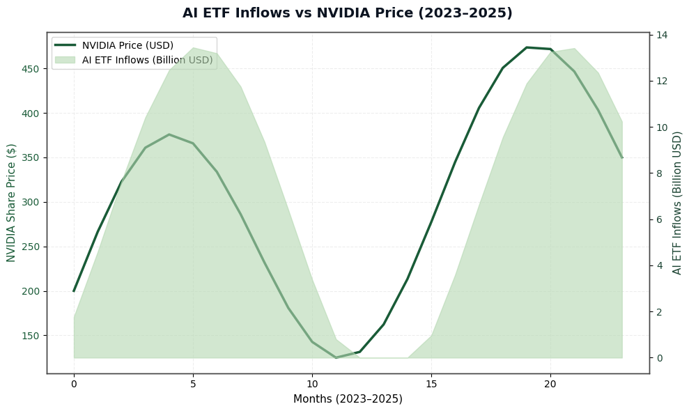 During the height of the AI boom, AI-themed ETFs such as BOTZ and AIQ saw retail inflows double right after NVIDIA’s 2024 earnings rally. Investors chased momentum instead of compounding, and when volatility returned in early 2025, those inflows reversed sharply.